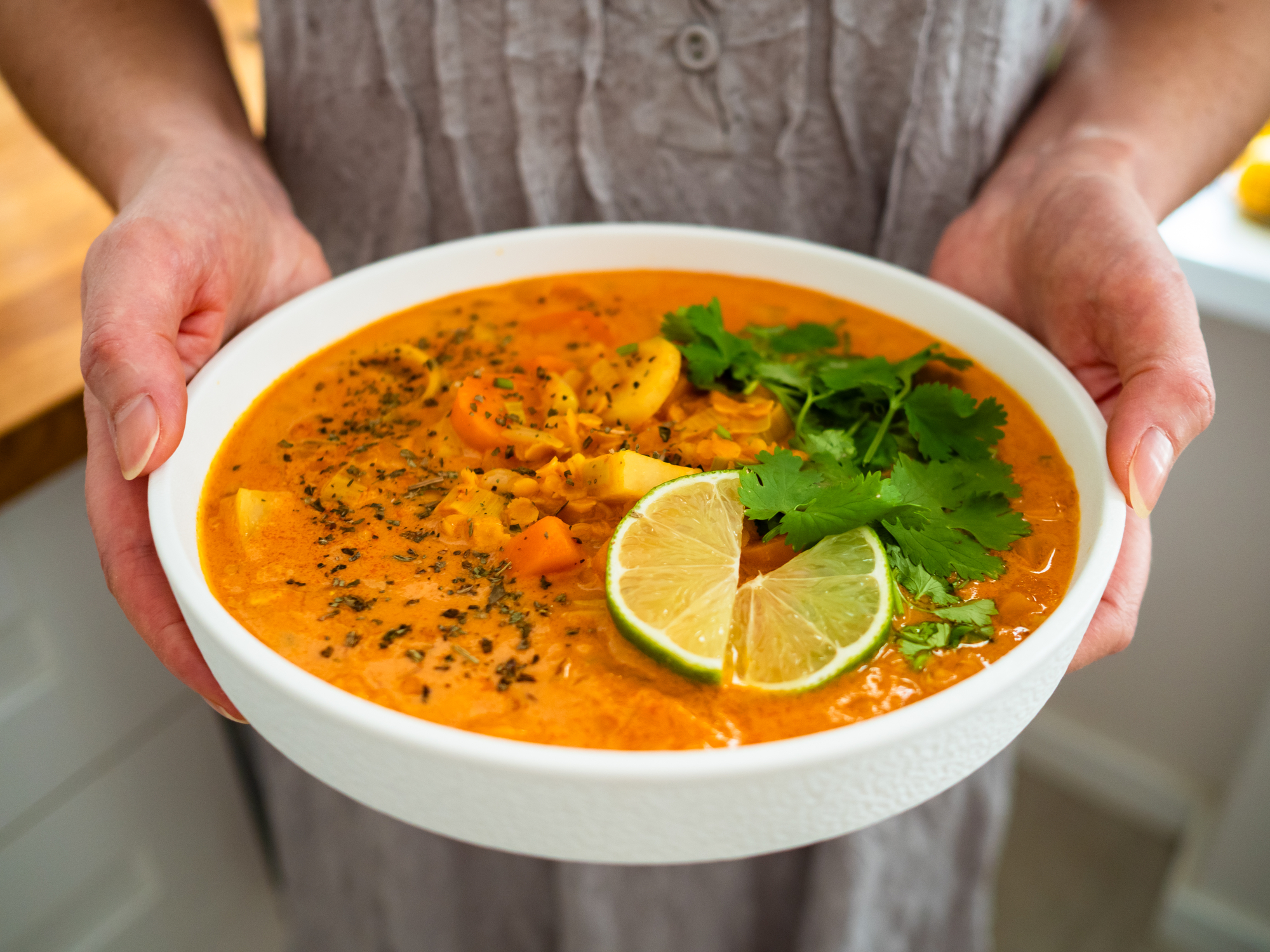 - Stir in lentils, coconut milk, and stock. Bring mixture to a simmer. Reduce heat to medium-low.