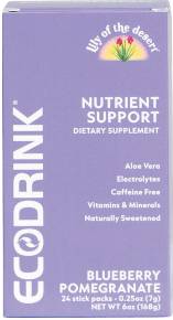 Lily of the Desert Ecodrink—Blueberry Pomegranate provides refreshing hydration with 28 essential nutrients, aloe vera, and electrolytes. Free from caffeine as well as artificial colors and sweeteners.