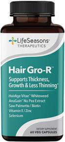 LifeSeasons Therapeutics Hair Gro-R encourages hair growth and reduces thinning with biotin, selenium, zinc, vitamin E, whiteweed aerial extract, and saw palmetto.