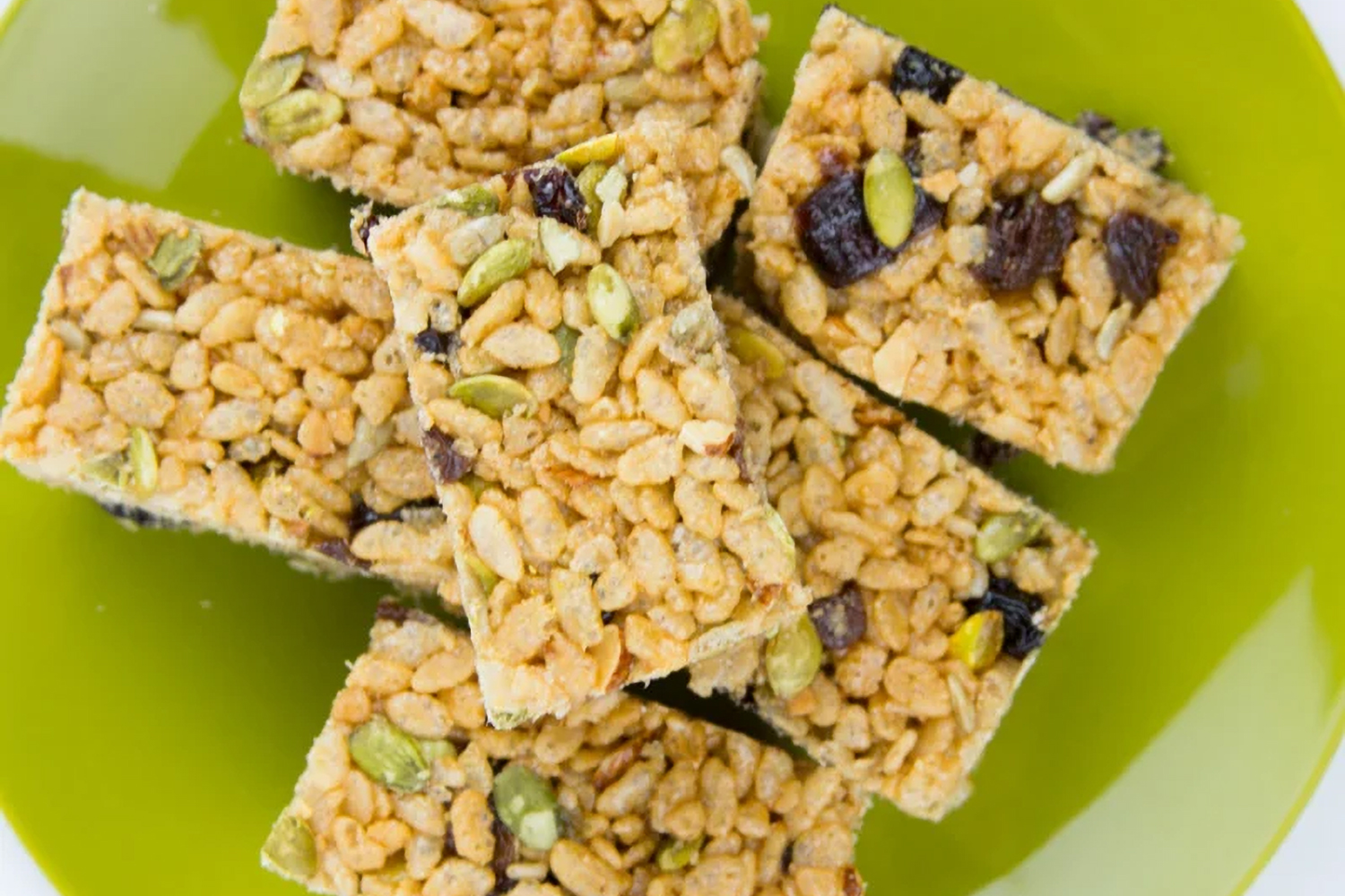 - Place the crispy cereal, dried fruit, seeds, and nuts in a mixing bowl. Pour the hot syrup over the mixture and mix thoroughly to coat all ingredients.